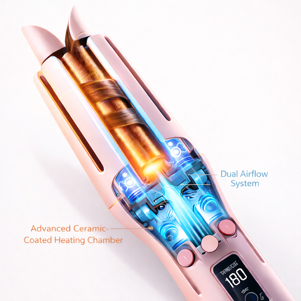 We focused on solving real problems. Anti-scald protection keeps you safe from burns. Anti-tangle design prevents hair from getting caught. Ceramic ion technology eliminates frizz and adds shine. Auto-rotation makes styling fast and effortless. Four simple innovations that work together for consistently beautiful curls in just 10 minutes.